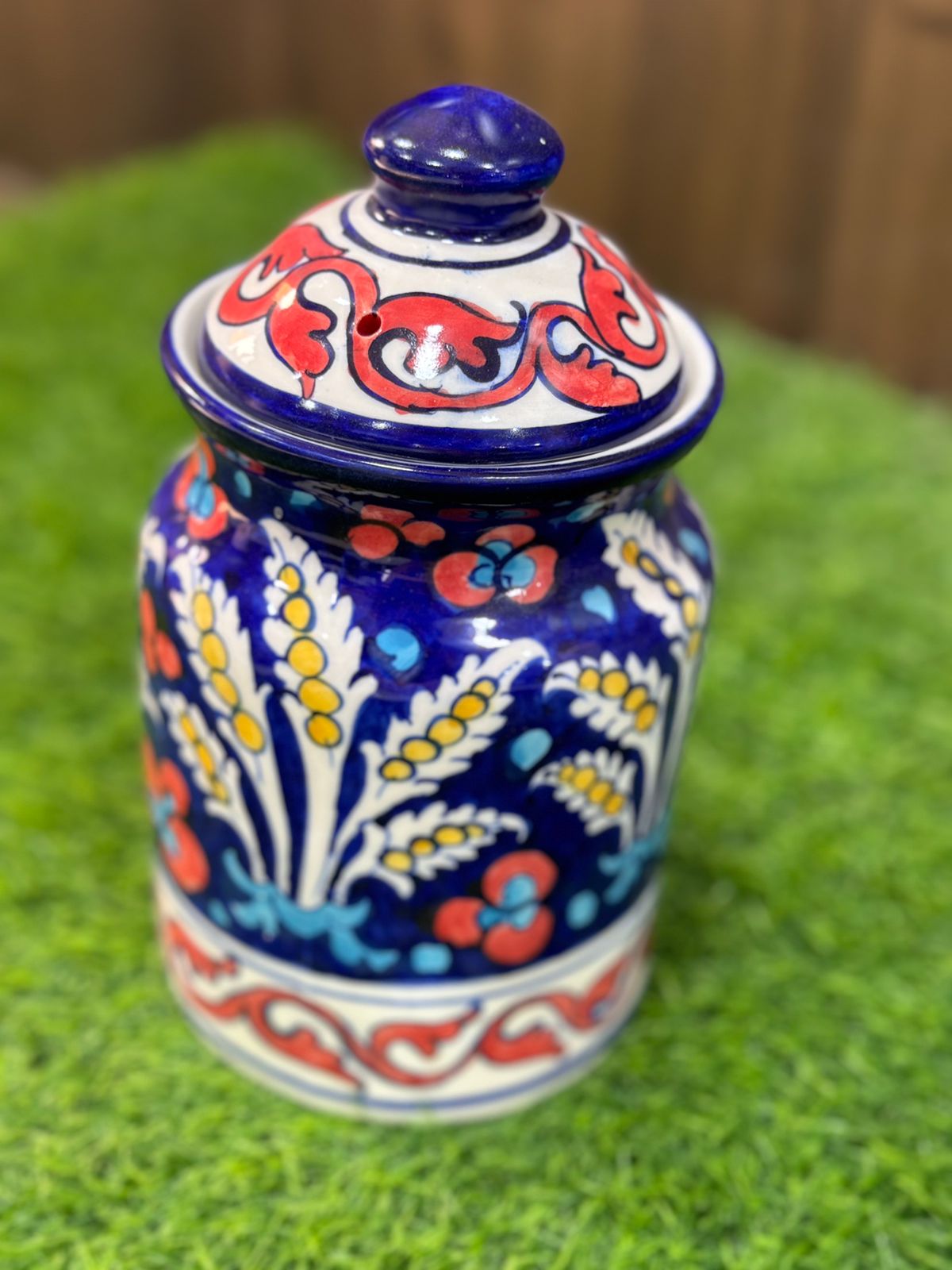 This beautifully handcrafted ceramic jar features a rich deep-blue base adorned with intricate hand-painted floral and vine motifs in vibrant red, white, and yellow tones. The jar is finished with a matching fitted lid, topped with a rounded knob and a small vent detail, adding both charm and functionality. A smooth glossy glaze enhances the colors and highlights the fine artisanal craftsmanship. Ideal for storing dry goods, spices, tea, or small household items, this jar also serves as an elegant decorative accent, bringing a traditional and artistic touch to any kitchen or living space.