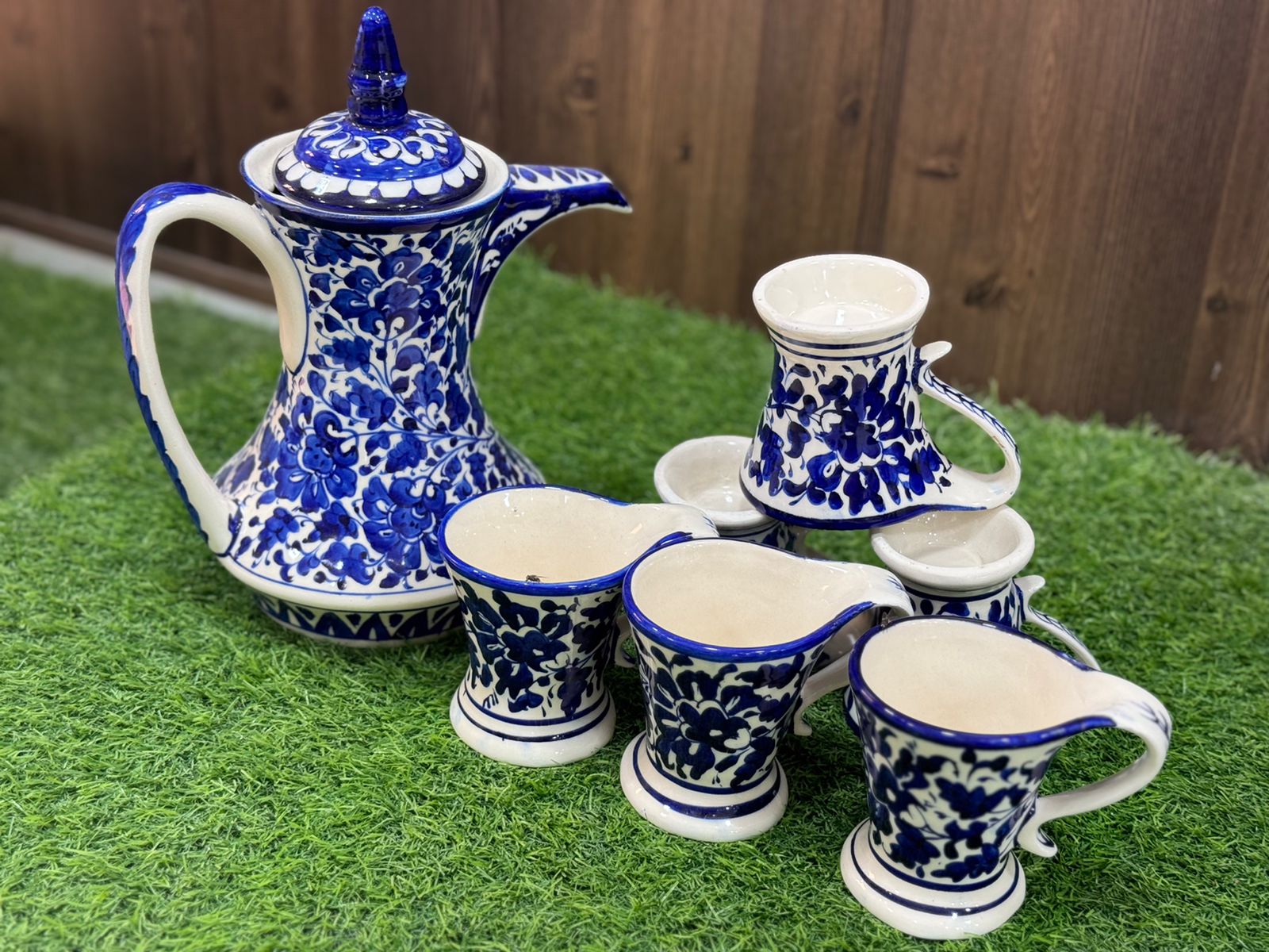 The cups are small and handle-less, arranged symmetrically on either side of the pot, making the set look balanced and attractive. In the background, there is colorful wall art and decorative feathers, which enhance the cultural and artistic feel of the scene.