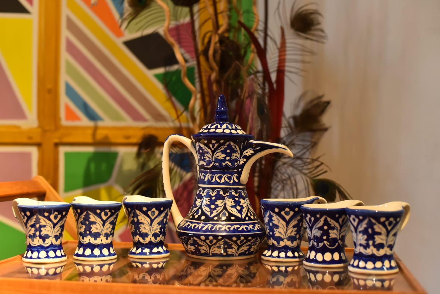 The image shows a beautifully crafted ceramic qahwa set arranged neatly on a serving tray. The set includes one traditional qahwa pot (dallah) and six small matching cups, all designed in a classic blue-and-white color scheme. The glossy finish and detailed artwork give the set a rich and elegant appearance.