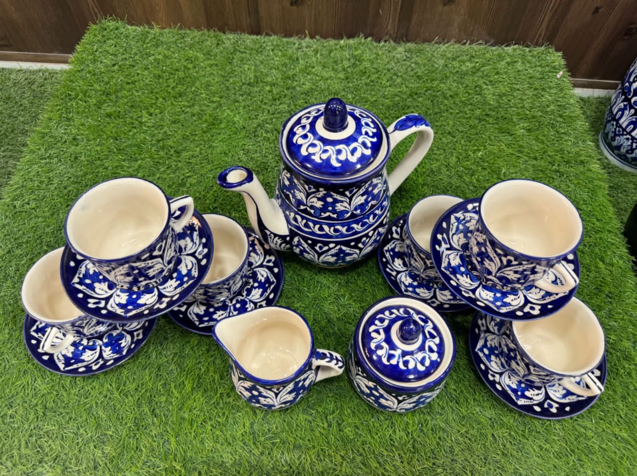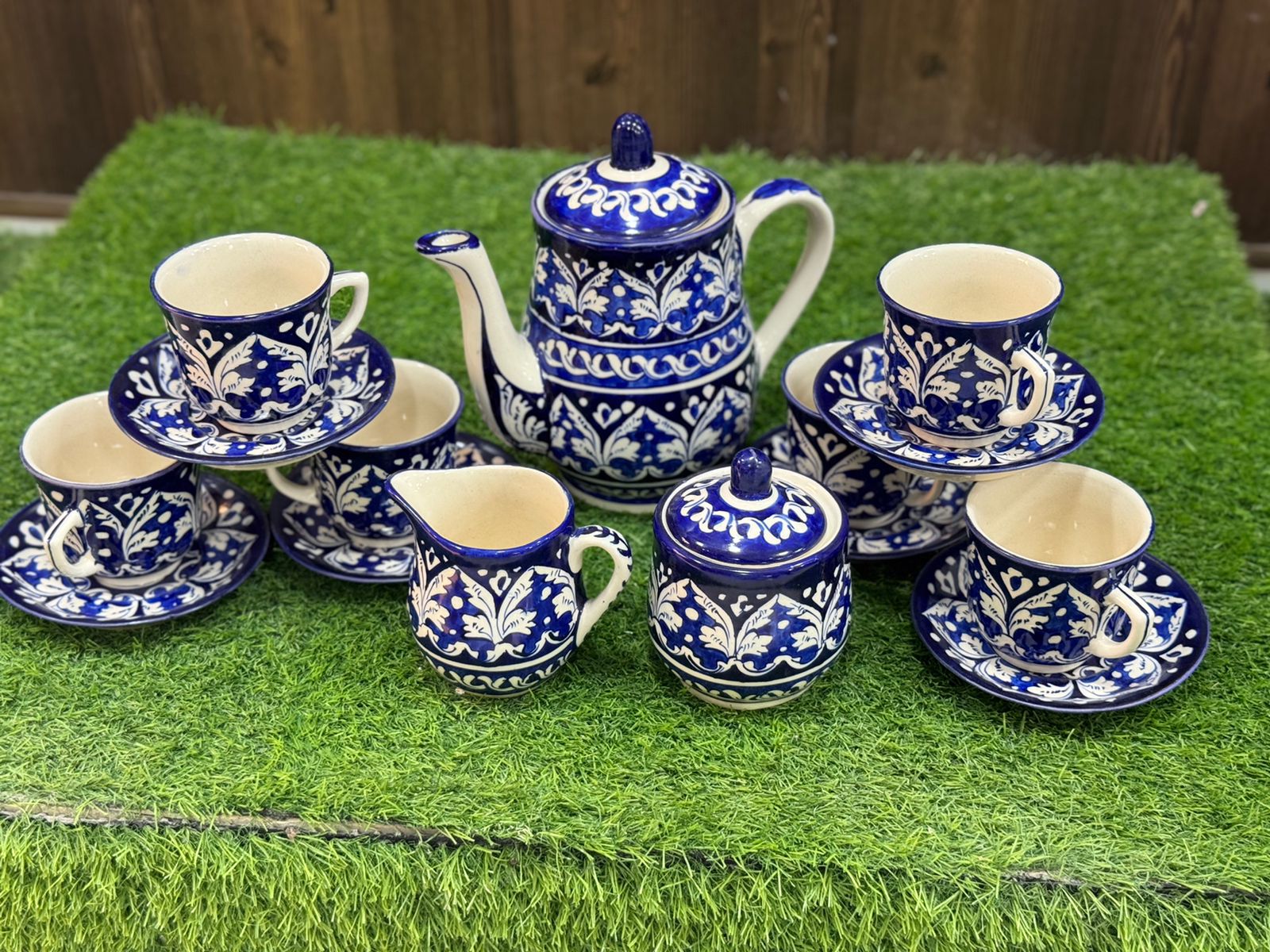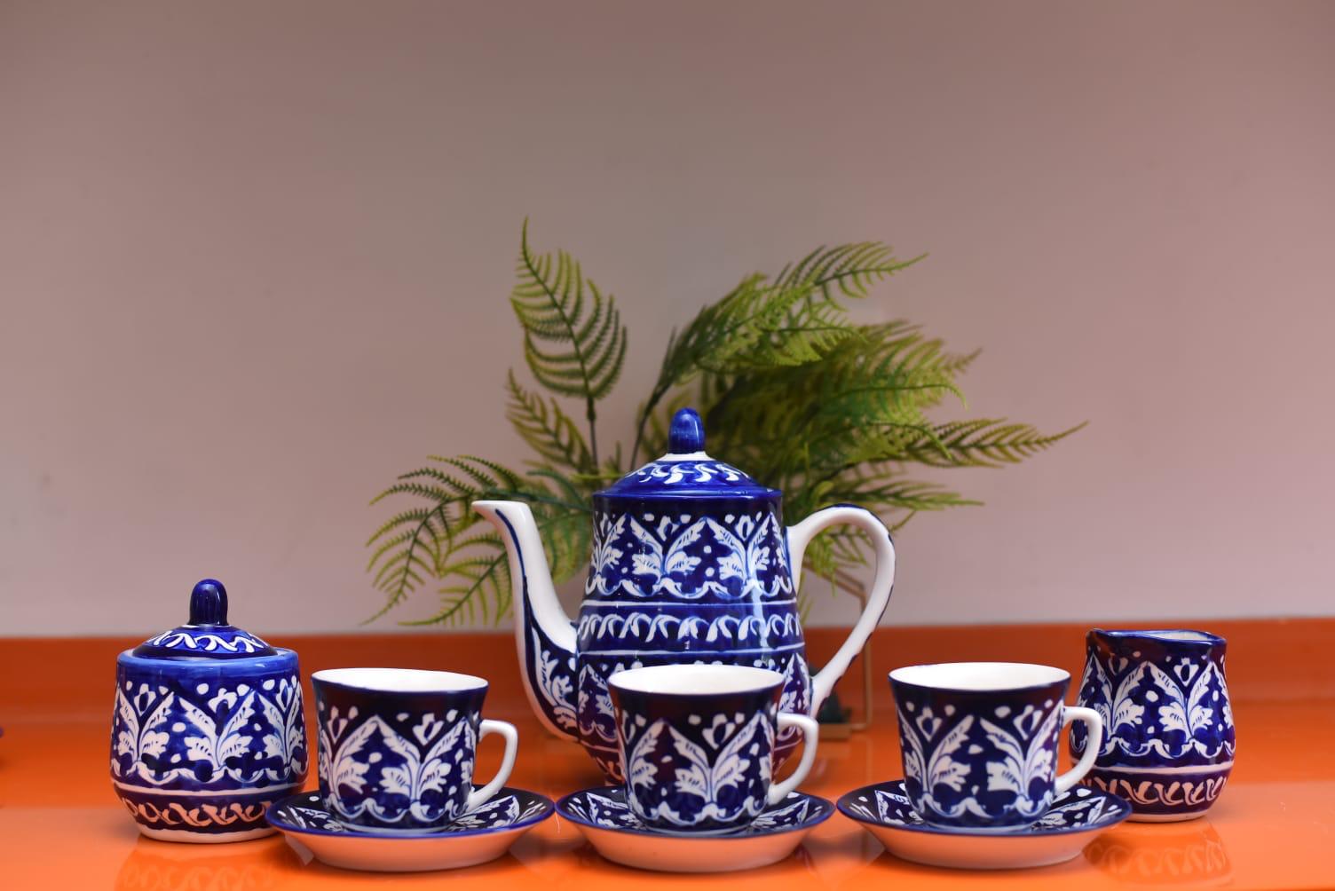 This elegant handcrafted ceramic tea set features a rich deep-blue base adorned with intricate white floral and vine motifs, giving it a classic and timeless appeal. The set includes a beautifully shaped teapot with a lid and curved spout, matching teacups with handles, coordinated saucers, a creamer jug, and a lidded sugar pot. Each piece is finished with a smooth glossy glaze, highlighting the fine hand-painted detailing and artisanal craftsmanship. Perfect for serving tea or coffee, this set adds sophistication to everyday tea time as well as special gatherings, making it both a functional serving set and a striking decorative centerpiece.