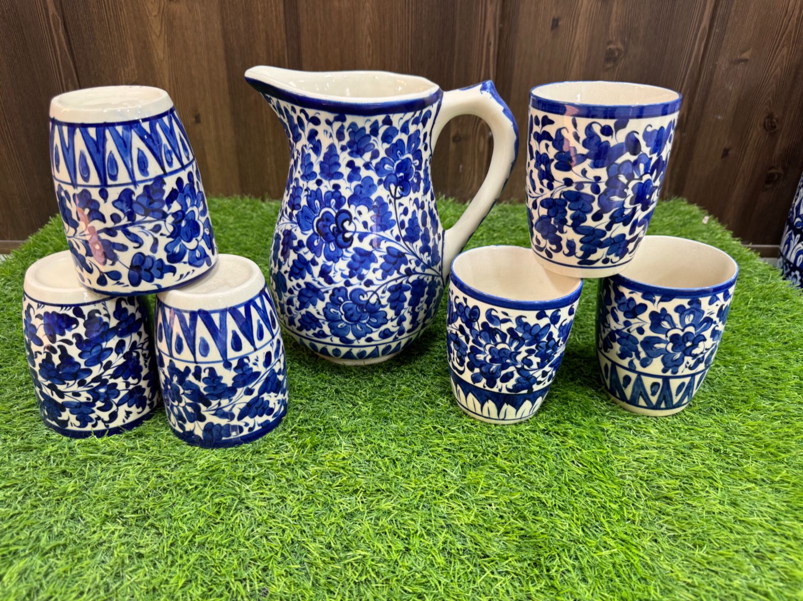This handcrafted blue-and-white ceramic water set features a beautifully hand-painted floral pattern that adds a classic and elegant touch to any table. The set includes one generously sized pitcher with a smooth handle and spout, along with six matching cups designed for comfortable everyday use. Finished with a glossy glaze, each piece showcases subtle variations that highlight its artisanal craftsmanship. Ideal for serving water, juices, or traditional beverages, this set blends functionality with timeless decorative appeal, making it perfect for daily dining, gatherings, or special occasions.